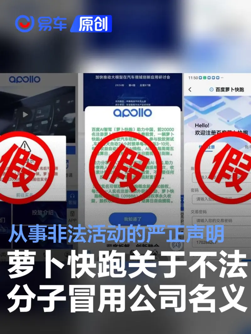 再次提醒广大网民,请认准萝卜快跑官方网站(网页链接)、官方社交账号(微信公众号:萝卜快跑自动驾驶;微信小程序:萝卜快跑;微博:萝卜快跑自动驾驶)、官方app(萝卜快跑),加强风险防范意识,切勿轻信不法分子的任何伪造内容与虚假承诺,防止遭受损失。
