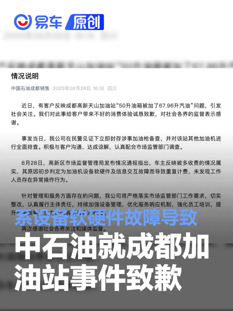 成都高新区市场监督管理局发布通报后,中石油四川成都销售分公司也就“50升油箱被加67.96升汽油”一事发布致歉声明,表示针对管理和服务方面存在的问题,公司将严格落实市场监管部门工作要求,切实整改,认真履行主体责任,持续加强设备管理,优化服务响应机制,强化员工培训,提升服务质量,全力保障消费者合法权益。