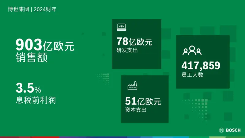 易车讯 德国斯图加特和雷宁根——面对市场环境对业务增长造成的巨大影响,博世集团依然稳步推进其2030战略,持续巩固自身竞争优势。2024财年,全球领先的技术和服务供应商博世集团实现903亿欧元销售额,较上一年下降了1.4%,调整汇率影响后降幅为0.5%。息税前利润为31亿欧元(2023财年为48亿欧元),息税前利润率为3.5%。博世集团董事会主席史蒂凡·哈通博士表示:“2024财年,我们在成本优化、架构调整和产品组合升级方面取得了显著进展。我们坚持2030战略所设定的目标,致力于实现业务持续增长并进一步提升财务独立性。这些具有挑战性的目标为我们在复杂多变的全球局势下明确了发展方向。博世目标在未来五年内成为其核心市场中排名前三的供应商。”