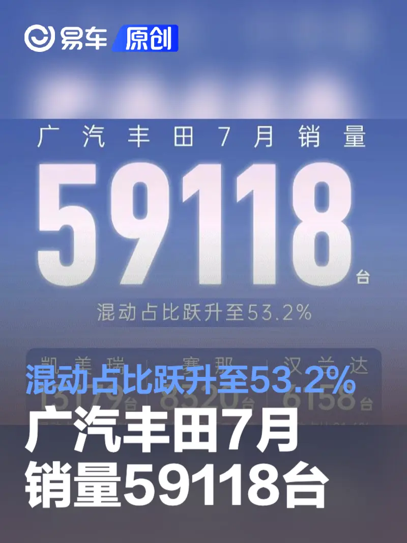 易车讯 日前,广汽丰田公布最新销量数据。2024年7月广汽丰田销量59118台,混动占比跃升至53.2%。