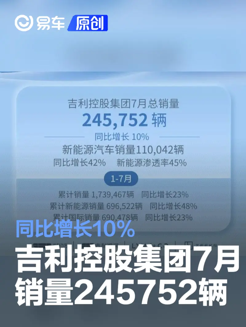 2024年1-7月,吉利控股集团累计销量1739467辆,同比增长23%;累计新能源销量696522辆,同比增长485;累计国际销量690478辆,同比增长23%。