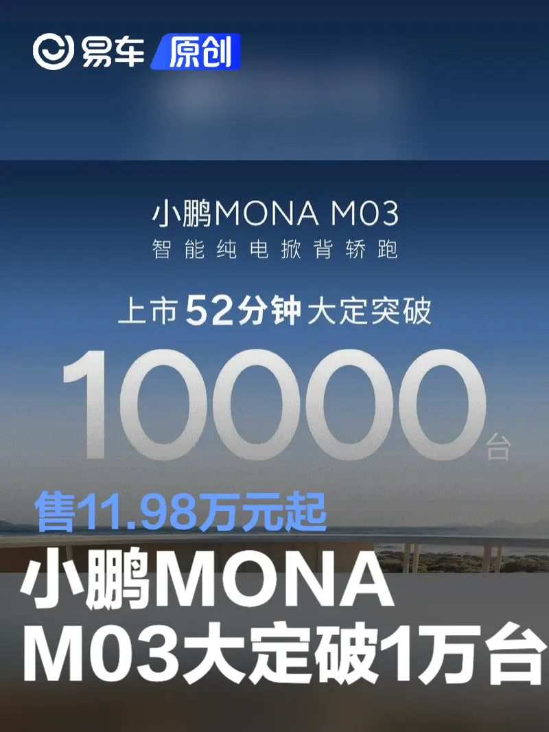 易车讯 日前,小鹏汽车官方公布了最新订单数据。官方表示,小鹏mona m03上市52分钟大定突破10000台。新车于8月27日正式上市,共推出3款车型,售价区间为11.98-15.58万元。