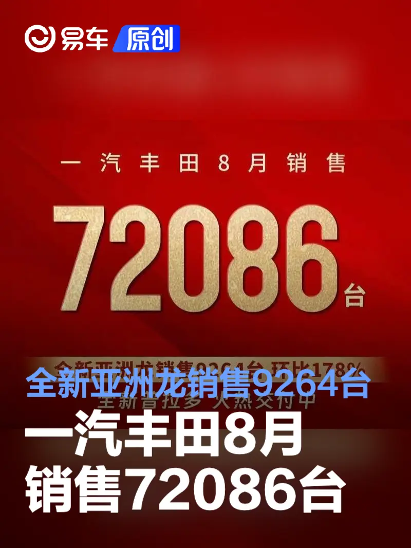 易车讯 9月1日,一汽丰田公布最新销量数据。一汽丰田8月销售72086台,其中全新销售9264台,环比增长178%。