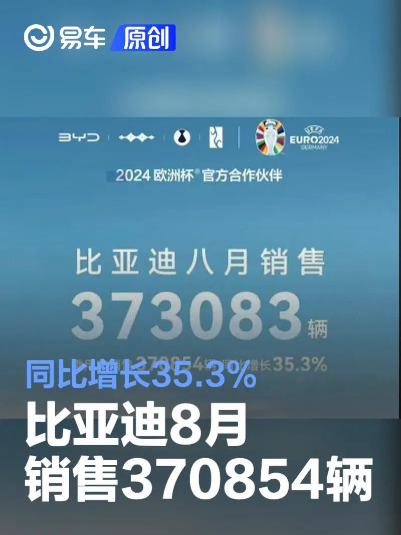 易车讯 9月1日,比亚迪公布最新销量数据。官方表示,比亚迪八月销售373083辆,再创纪录。其中,乘用车销售370854辆,同比增长35.3%。2024年比亚迪乘用车累计销售2318798辆。