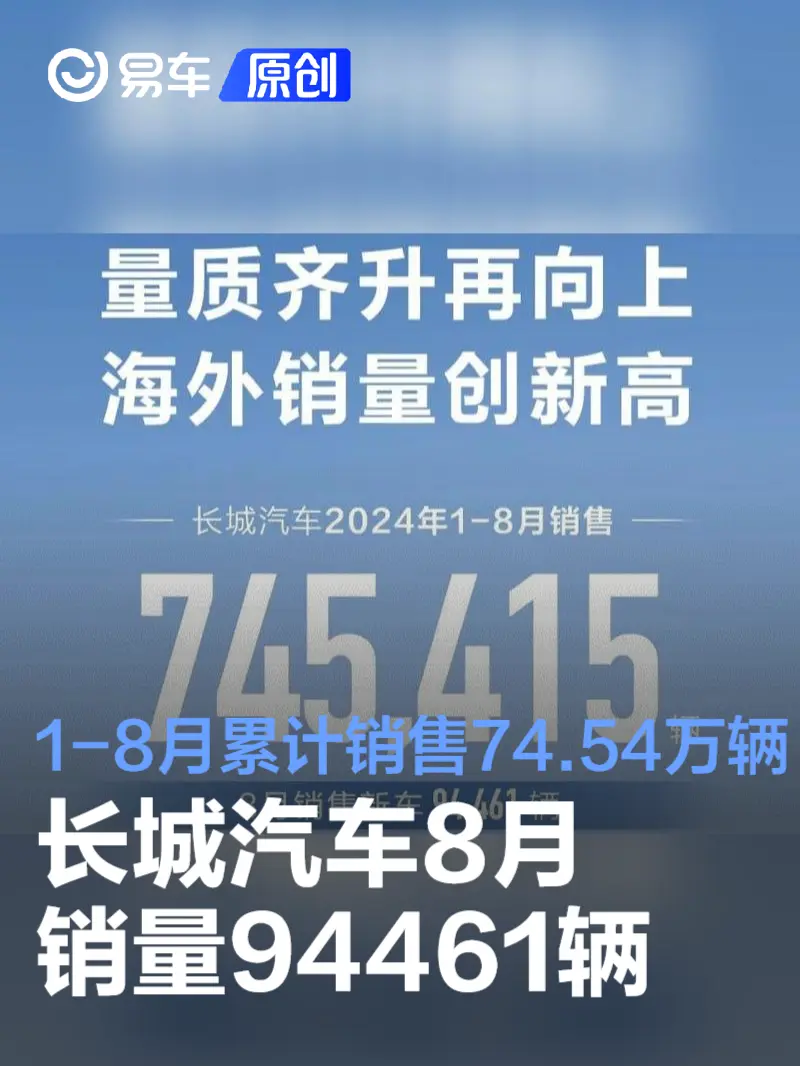 易车讯 日前,长城汽车公布了最新销量数据。8月销售新车94461辆,1-8月累计销售745415辆,其中新能源车销量181363辆,同比增长22.17%。1-8月海外销量280139辆,同比增长54.20%。
