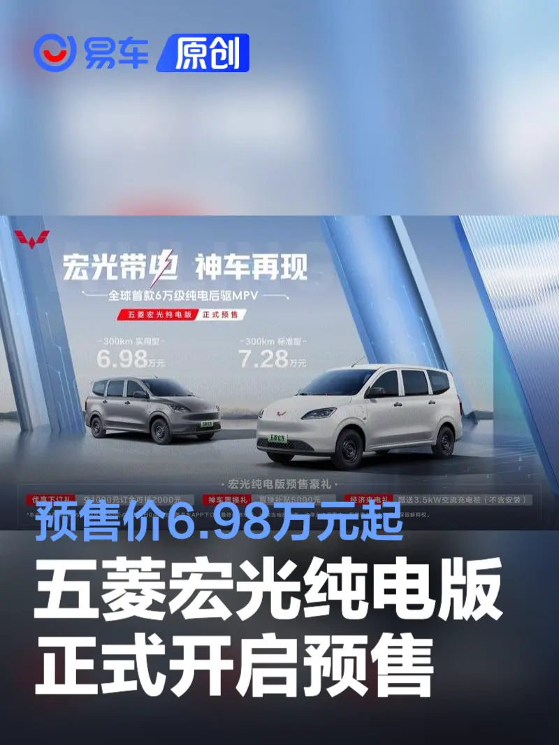 即日起至上市前,用户可通过五菱汽车app、五菱汽车小程序等线上渠道下订,立享纯电预售三重豪礼。包括优享下订礼,交1000元订金即可抵扣2000元购车款;神车置换礼,旧车置换可享5000元置换补贴;经济来电礼,购车即赠3.5kw交流充电桩(不含安装)。