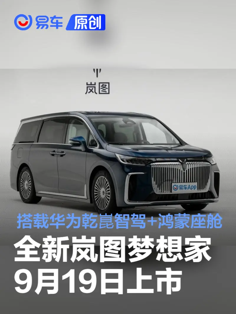 易车讯 日前,我们从岚图汽车官方获悉,全新梦想家将于9月19日上市。该车将搭载华为乾崑智驾ads 3.0以及鸿蒙座舱,预售价为34.99-48.99万元。