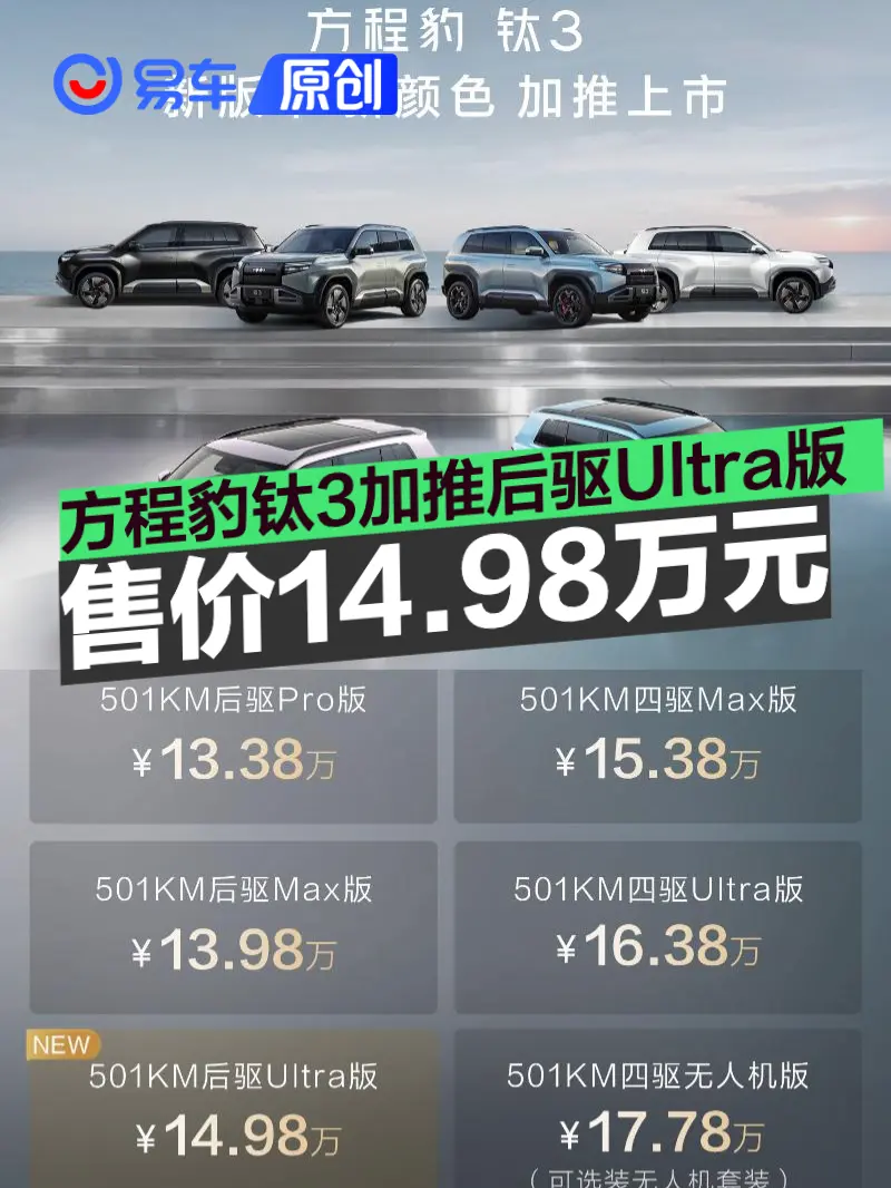 易车讯 今日,方程豹汽车官宣:方程豹加推后驱ultra版,售价14.98万元。该车新增微光粉、冰晶蓝全新车色。