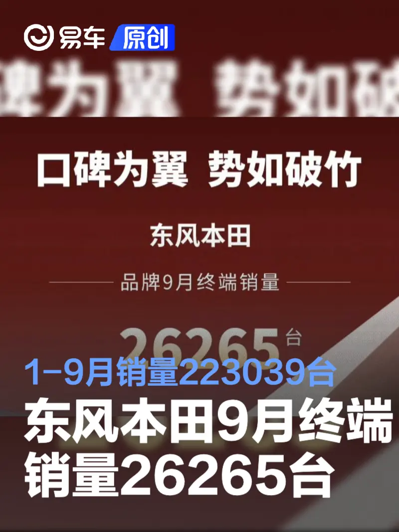 易车讯 日前,东风本田公布最新销量数据。2025年9月,东风本田终端销量26265台,1-9月累计终端销量223039台。