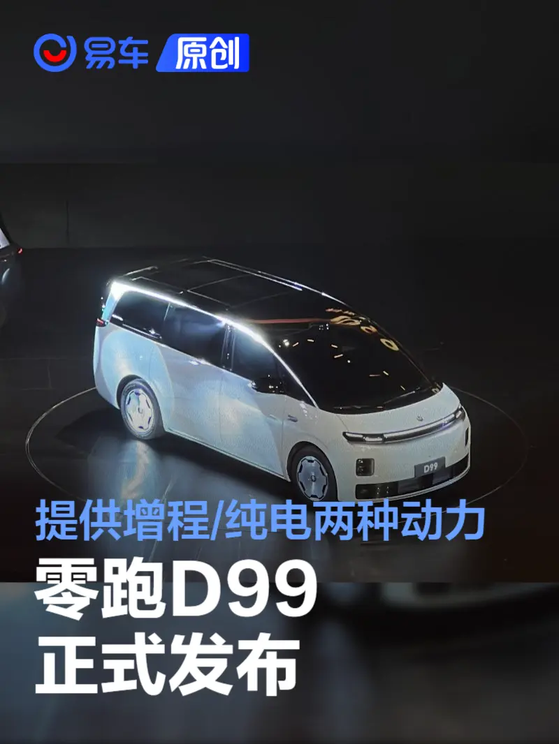 易车讯 12月28日,零跑全新mpv d99正式发布。新车采用子弹头样式的设计语言,提供增程和纯电两种动力,增程版行业首发双能电机四驱增程,采并配备80.3kwh大电池组,纯电车型采用全栈1000v三电系统,并行业首发宁德时代115kwh超级混合电芯。