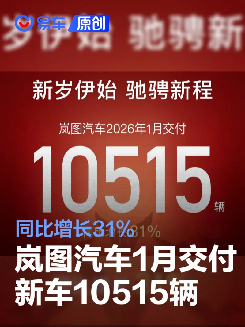 易车讯 2月1日,岚图汽车公布最新销量数据,2026年1月,岚图汽车交付新车10515辆,1月销量连续三年连升,同比增长31%。