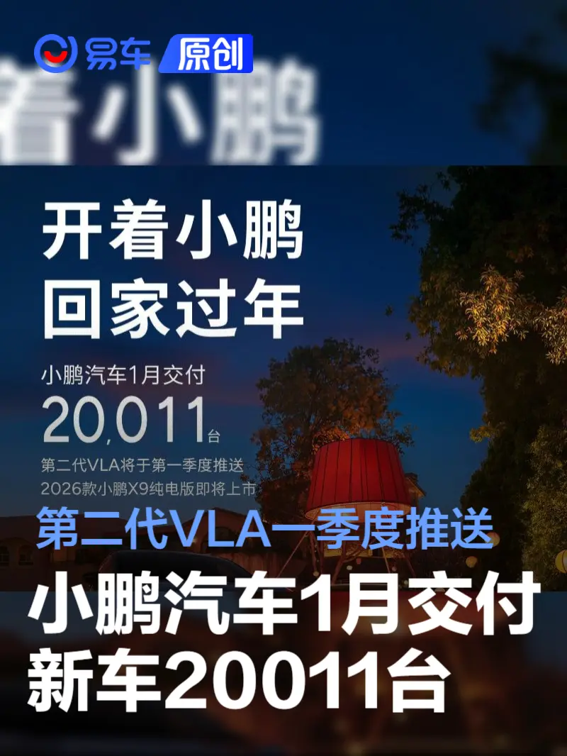 易车讯 2月1日,小鹏汽车公布最新交付数据。2026年1月小鹏汽车共交付新车20011台。同期交付车辆,相较于传统燃油车型,全生命周期预计可减少碳排放约30万吨,相当于494万棵中等树苗10年的固碳量。