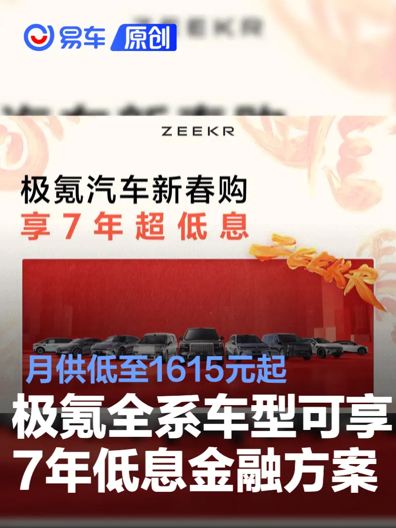 易车讯 2月2日,极氪官方宣布全系车型可享7年低息金融方案,首付2.98万元起,月供低至1615元起。