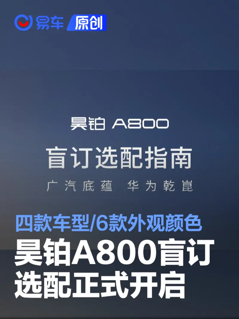 易车讯2月11日,广汽昊铂宣布旗下旗舰轿车盲订选配正式开启。昊铂a800共提供四款车型,包括六款外观颜色及三款内饰颜色。昊铂a800已于2025年12月19日开启盲订,支付88元/888元可享多重权益,新车搭载华为乾崑智驾huawei ads 4与鸿蒙座舱harmonyspace 5。