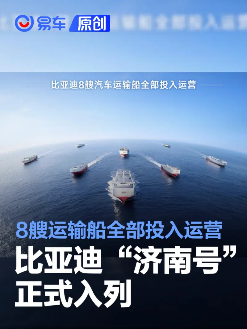 易车讯 今日,比亚迪官宣:第8艘汽车运输船“济南号”正式入列。比亚迪出海舰队圆满集结,全速推进中国汽车国际化进程。