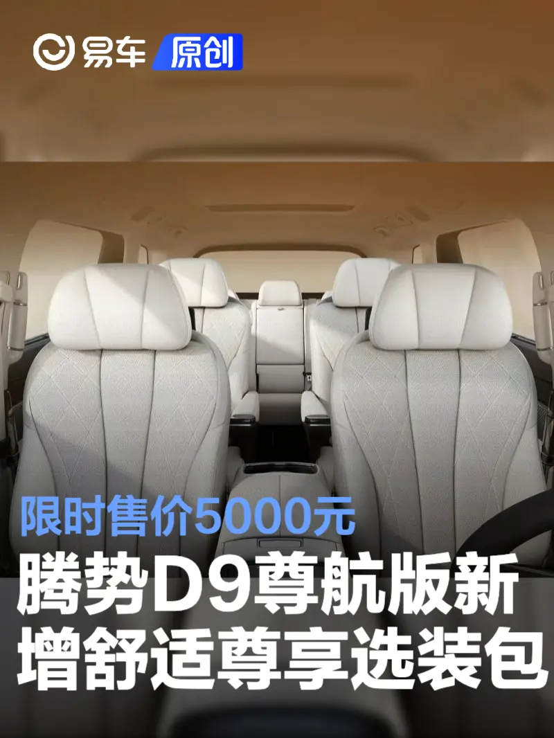 易车讯 9月30日,腾势汽车官方宣布,腾势d9尊航版推出舒适尊享选装包,选装包原价10000元,限时5000元即享。根据宣传图我们能够看出,选装包包括前排座椅通风/加热/按摩、方向盘加热、pm2.5绿净系统、负离子空气净化等功能。