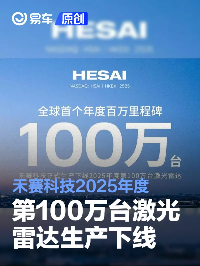 易车讯 10月3日,禾赛科技宣布,2025年度第100万台激光雷达已于9月底正式生产下线。禾赛成为全球首个年产量突破百万台的激光雷达企业。