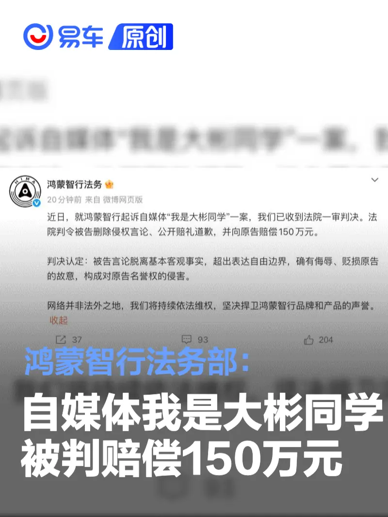 易车讯 2月11日,鸿蒙智行法务部在官方账号发文表示,近日,就鸿蒙智行起诉自媒体“我是大彬同学”一案,我们已收到法院一审判决。法院判令被告删除侵权言论、公开赔礼道歉,并向原告赔偿150万元。
